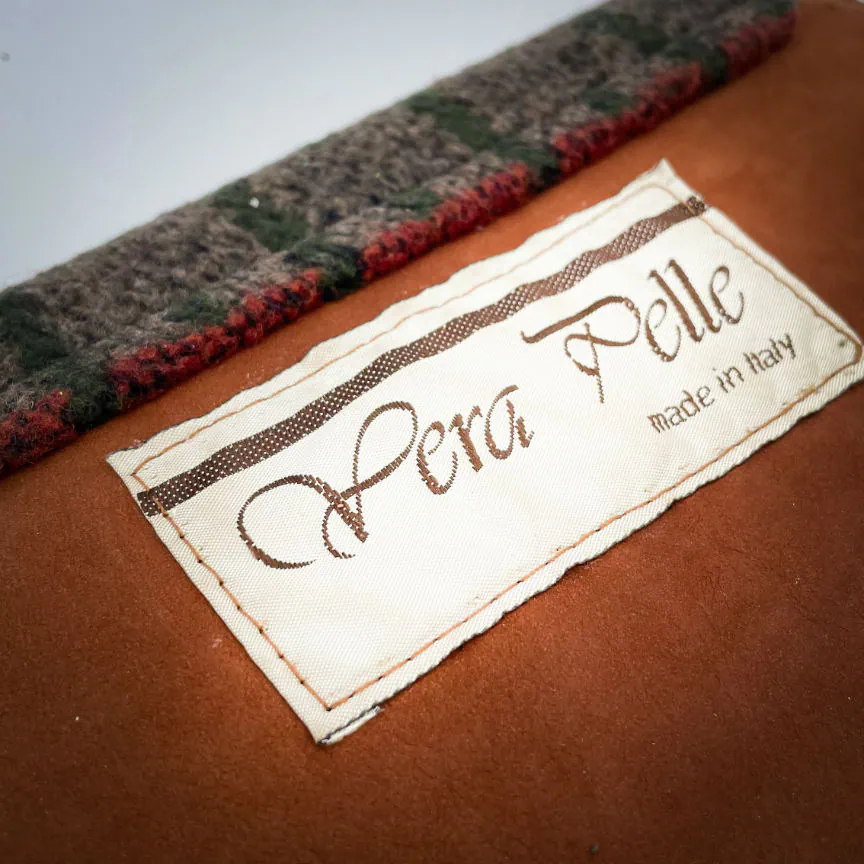 - Exterior: Upcycled leather (cow suede?) and 100% wool knit ;