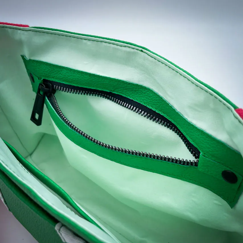 🍒 For this one, I wanted something fun and lighthearted, so I chose to upcycle small scraps of neon pink crepe, two-tone cherry blossom patterned neoprene, and apple green leather…