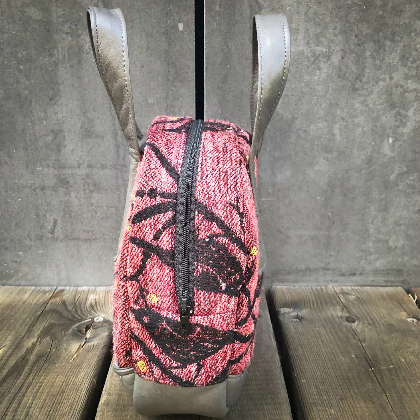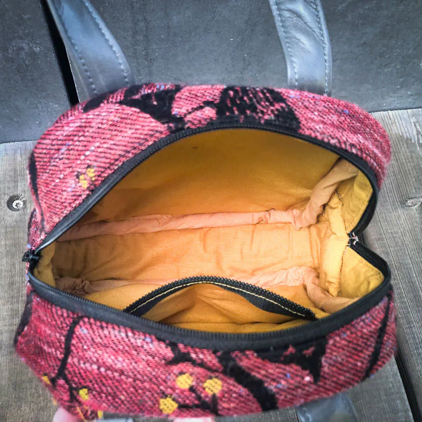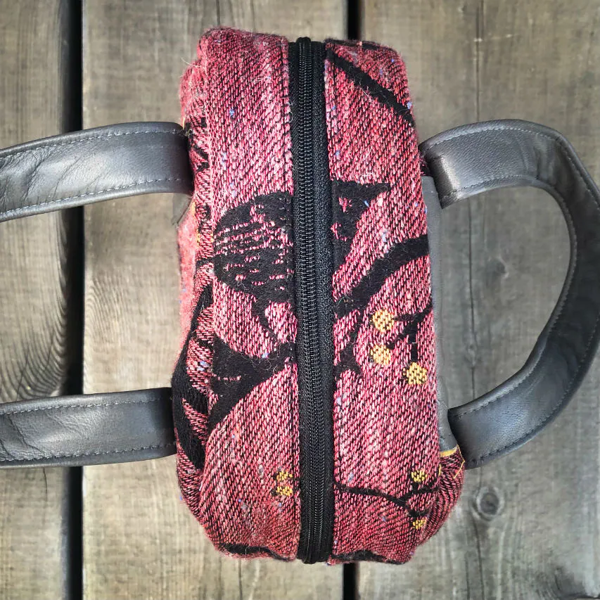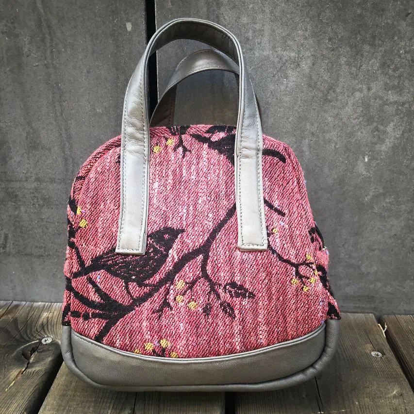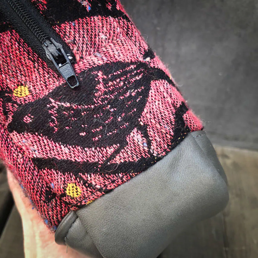 This piece is made from a babywearing wrap fabric with a soft and rich texture that showcases a lovely bird on a branch pattern, combined with scraps of equally soft and supple lambskin leather.