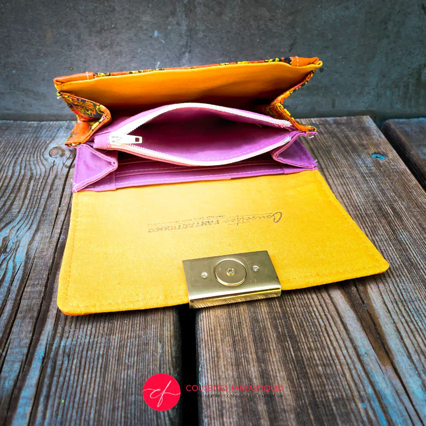 So I decided to make a cushion out of it for her, and I had some scraps left with which I wanted to create this compact and practical little wallet. Paired with a vibrant lambskin leather scrap and a golden half-moon clasp, you get an accessory that combines chic, fun, and functionality.