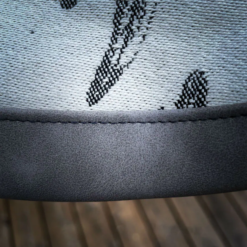 A flight of feathers in shades of gray for a piece that exudes lightness and simplicity. The softness of the tones and the pattern complements the cotton babywearing wrap and the velvety faux suede sent for testing by a supplier.