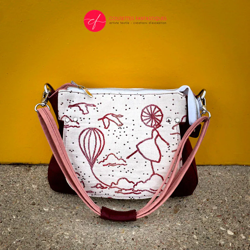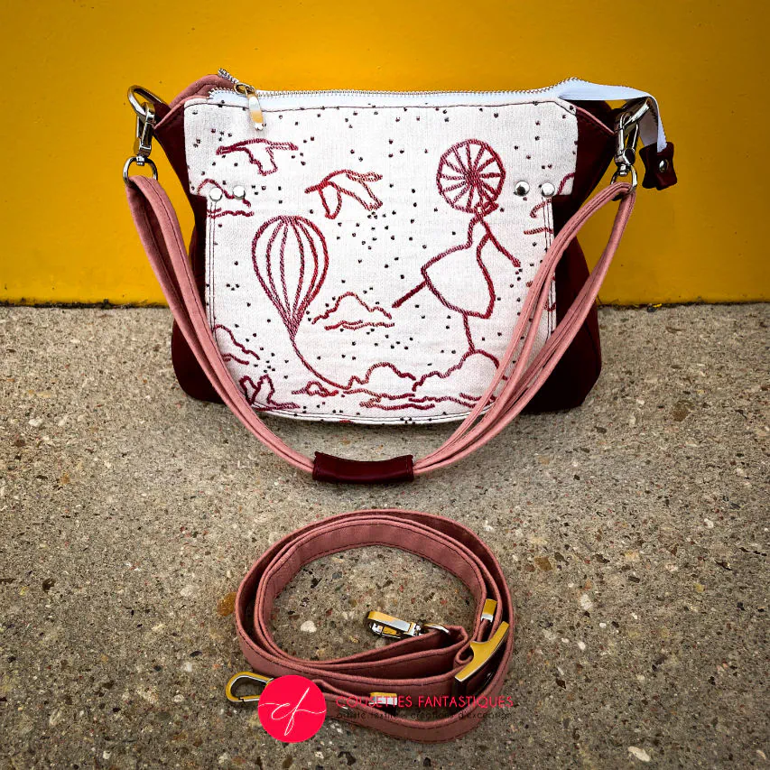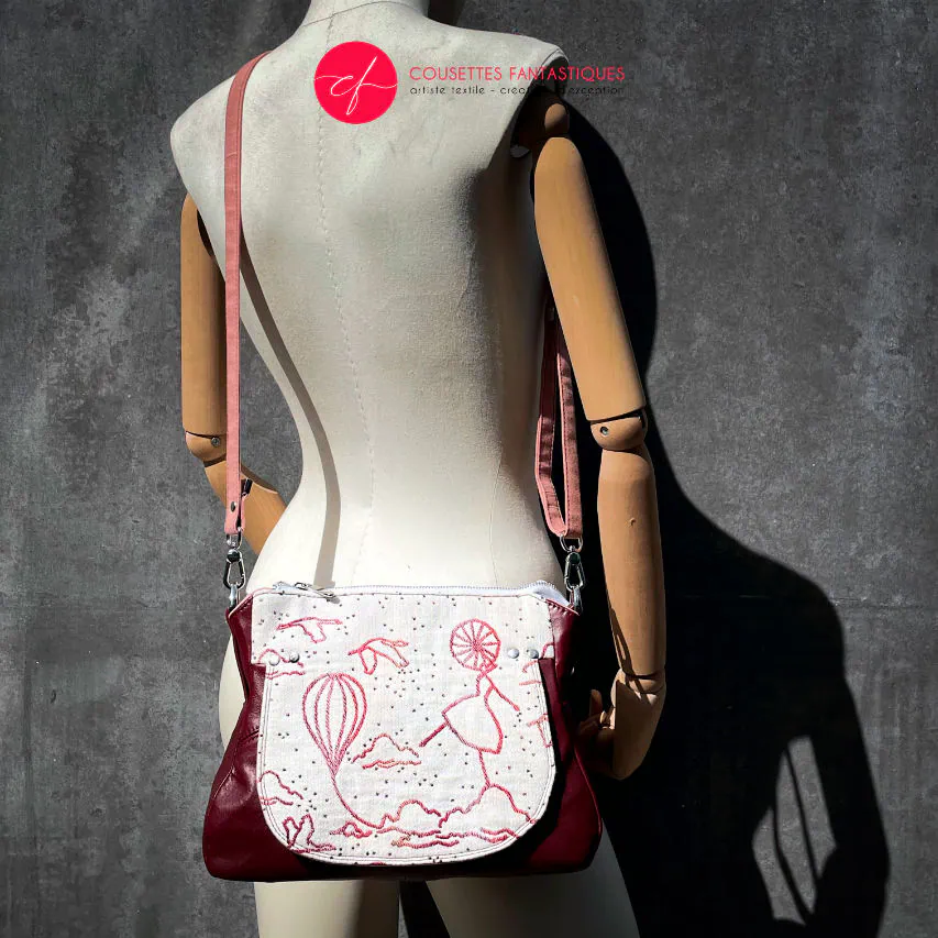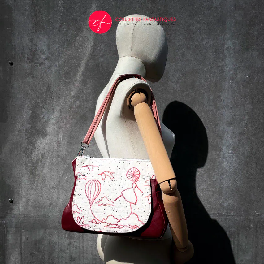 "Cogitations" Range / Collection Memory This piece is laden with emotions, as it speaks of lost friendship and unfinished dreams. Its shape reminds me of a hug, the one I wish I could give to my friend who left us too soon. Its colors are among her favorites, and she loved the poetic and dreamlike motif of the flap's fabric. I wanted/needed to pay tribute to her.