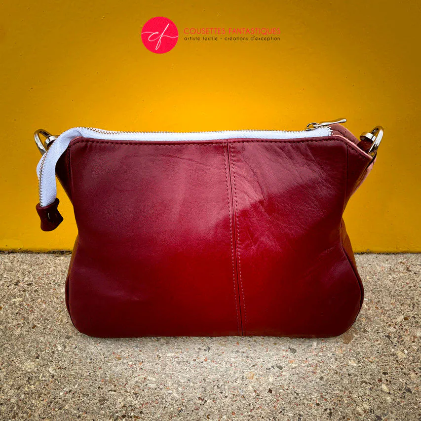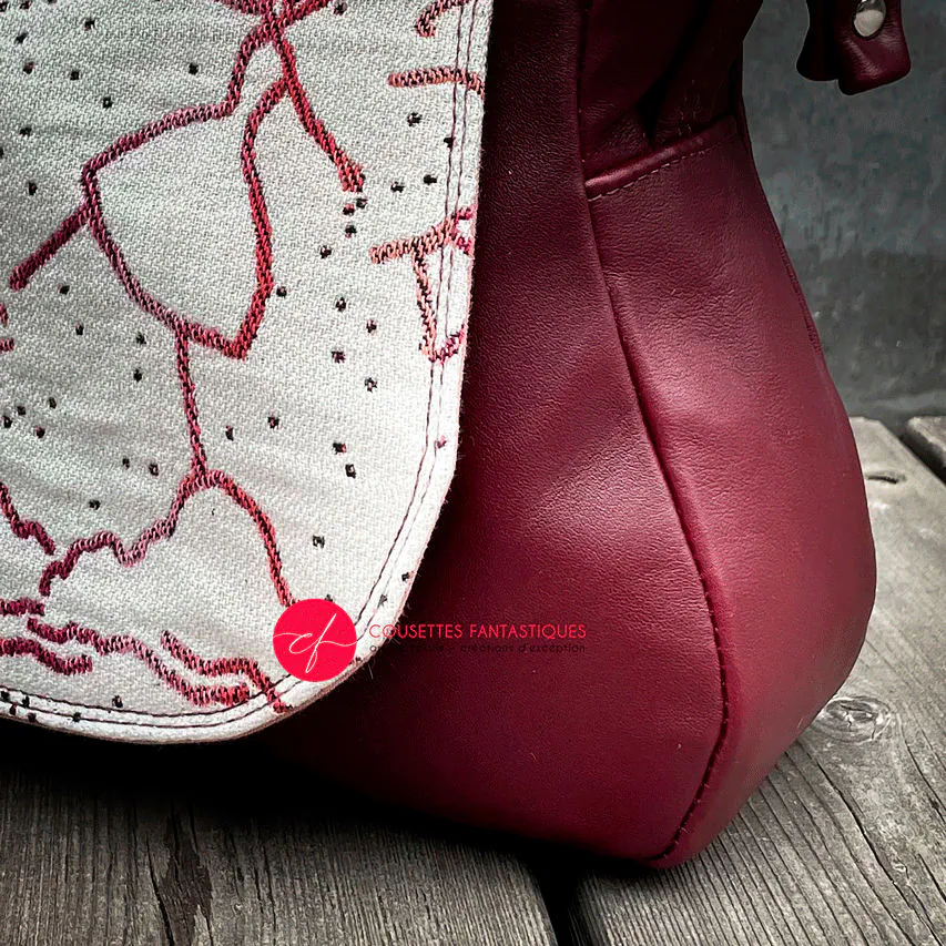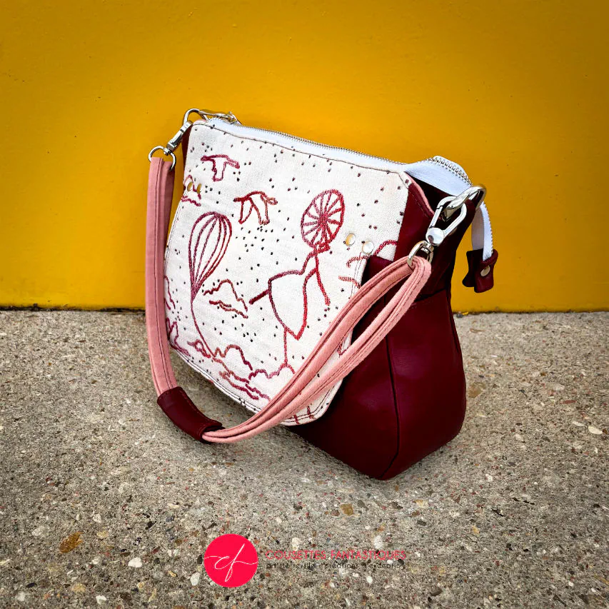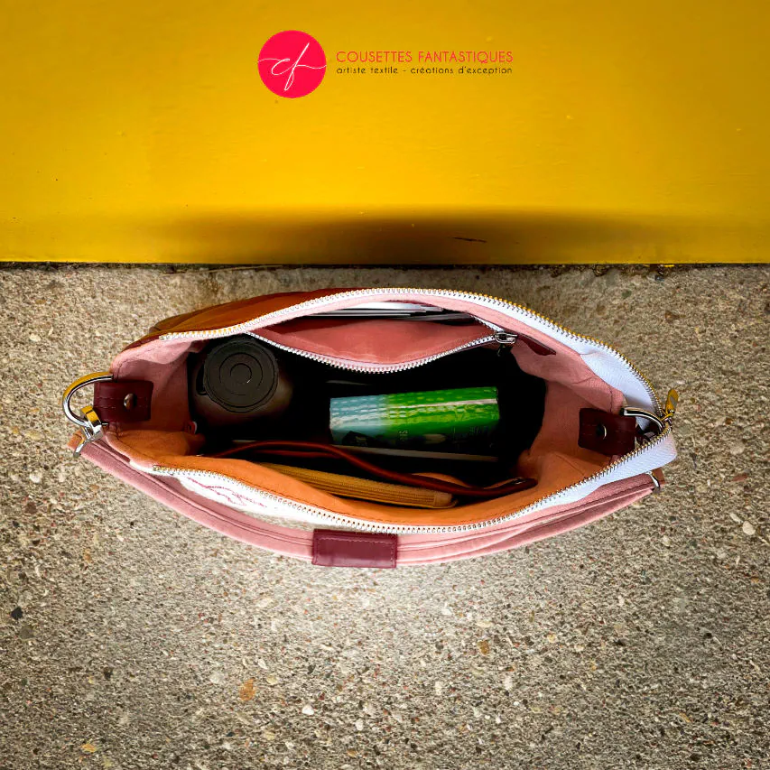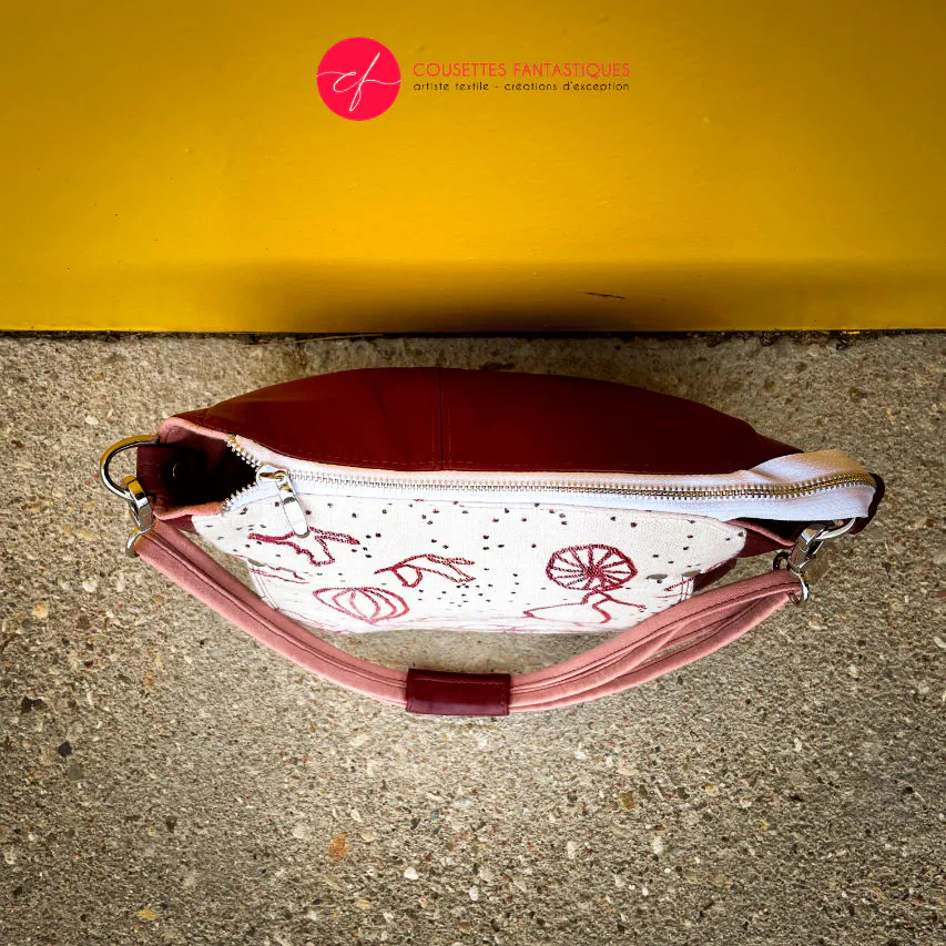 "Cogitations" Range / Collection Memory This piece is laden with emotions, as it speaks of lost friendship and unfinished dreams. Its shape reminds me of a hug, the one I wish I could give to my friend who left us too soon. Its colors are among her favorites, and she loved the poetic and dreamlike motif of the flap's fabric. I wanted/needed to pay tribute to her.
