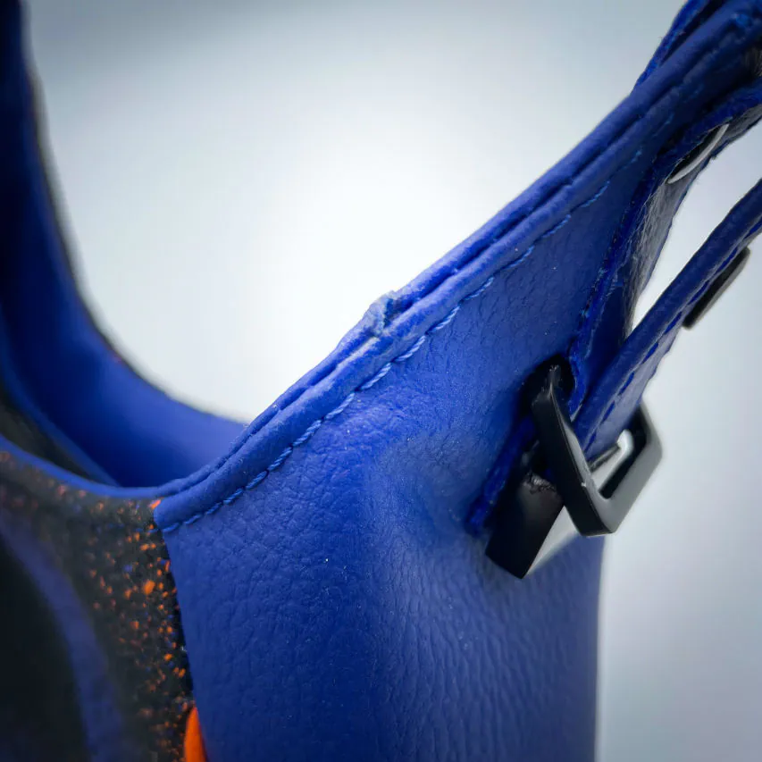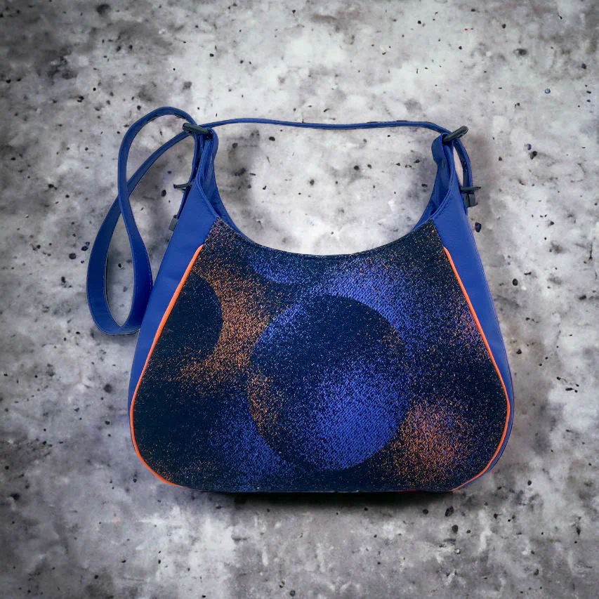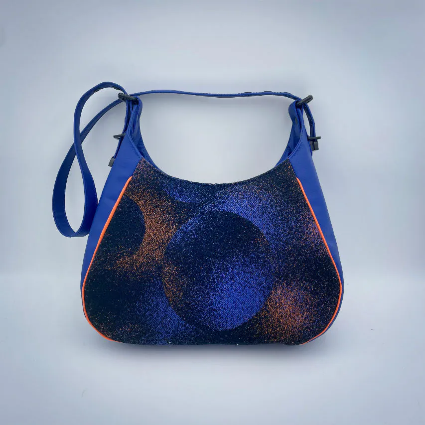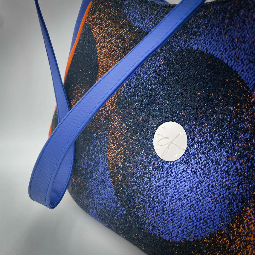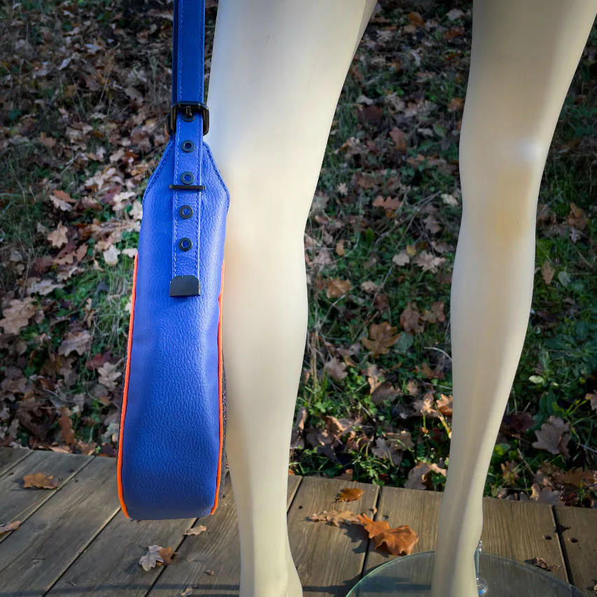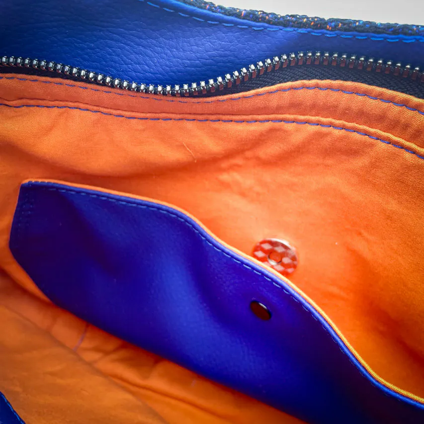 - Exterior: Yaro Slings “Exoplanet Duo Orange Cobalt” babywearing wrap scrap (100% cotton) and reclaimed faux leather (composition unknown) ;