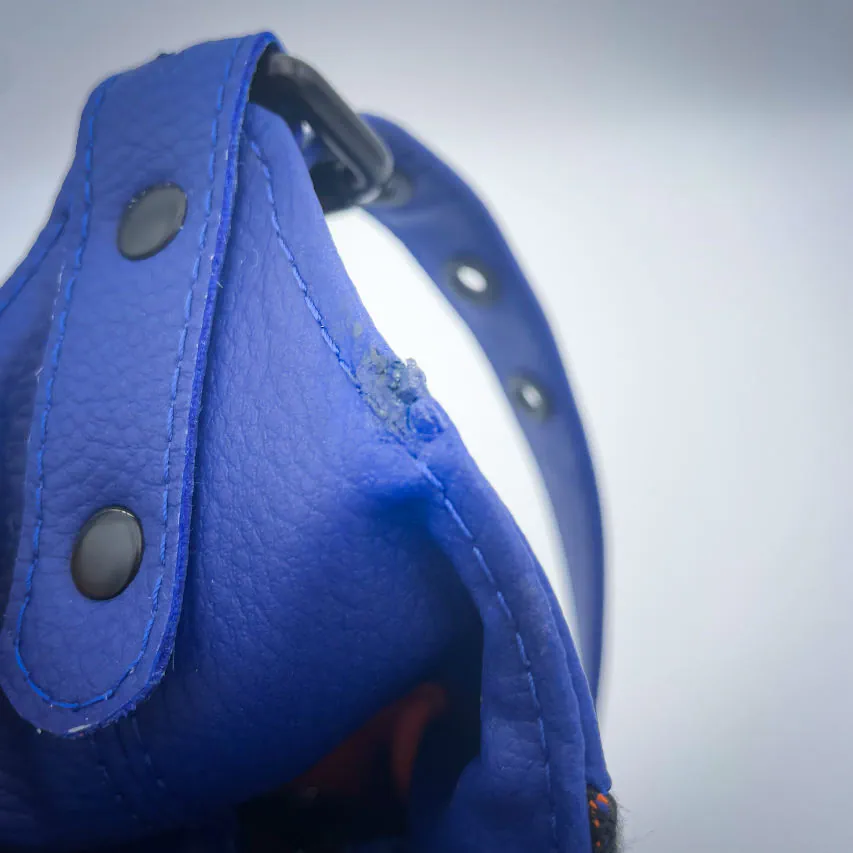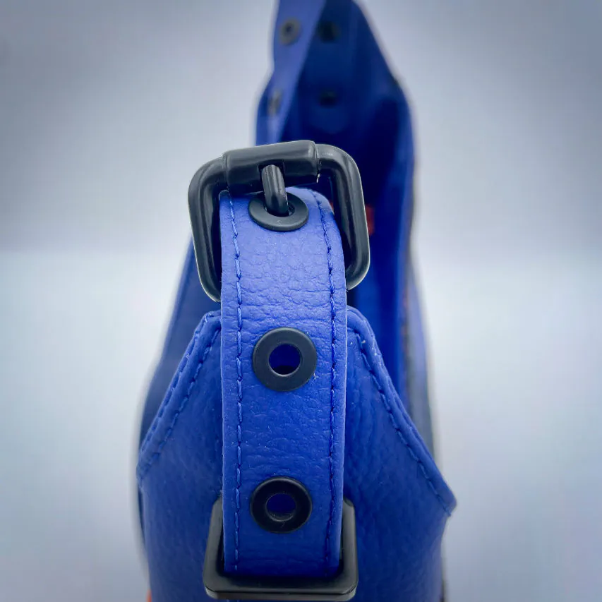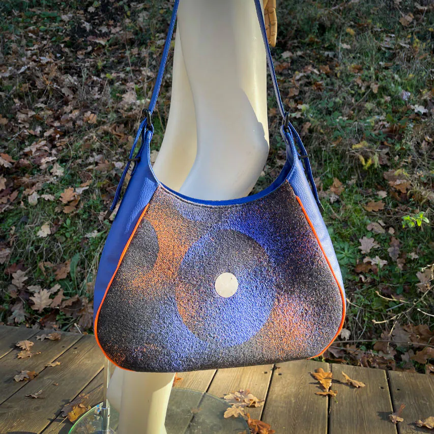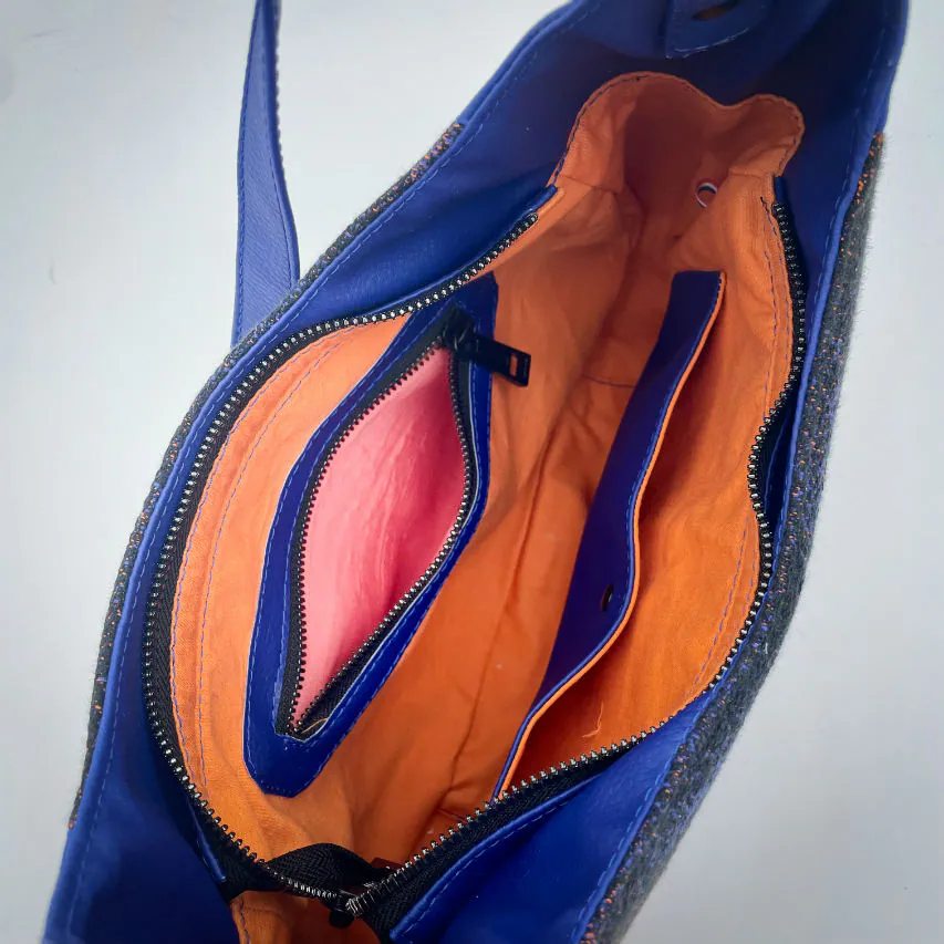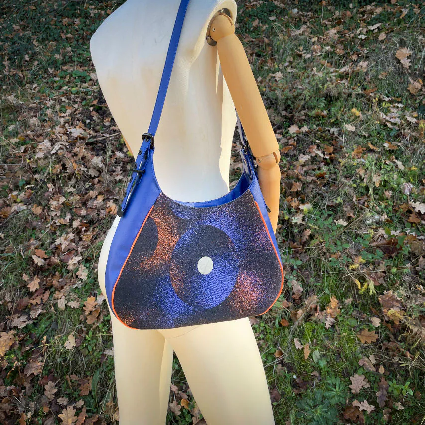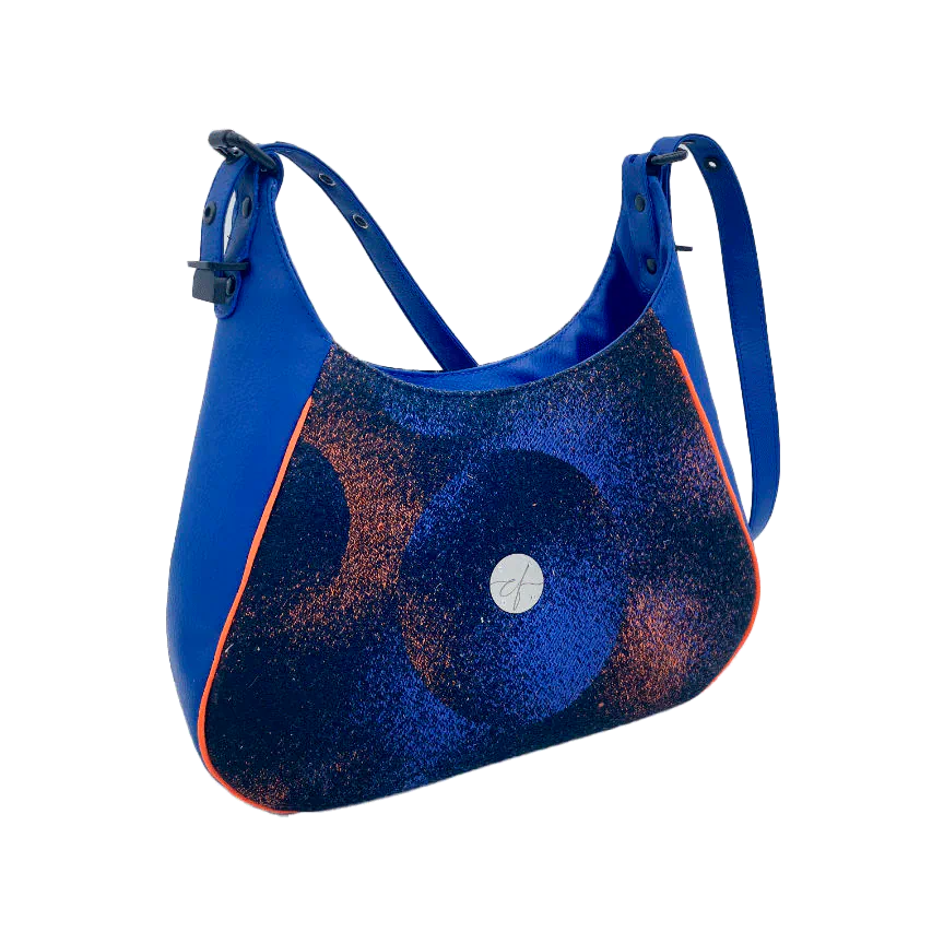 - Exterior: Yaro Slings “Exoplanet Duo Orange Cobalt” babywearing wrap scrap (100% cotton) and reclaimed faux leather (composition unknown) ;