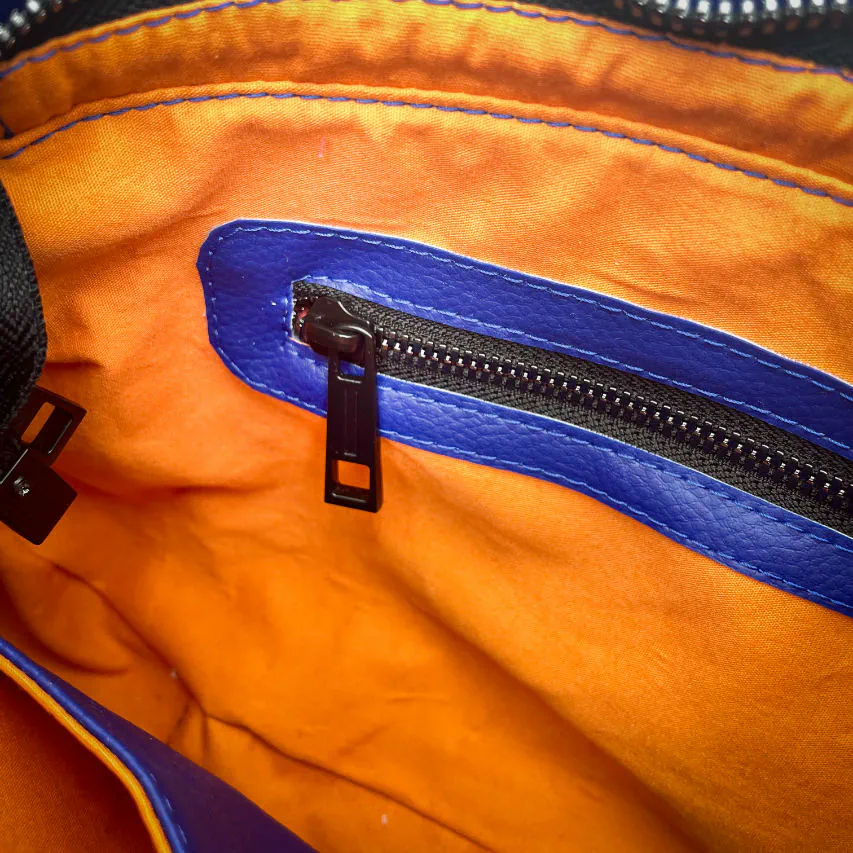 To compliment the wrap, I knew I had a piece left of the blue faux leather and some orange poplin that I thought would make an interesting and practical pop of color (lighter lined bags are commonly considered easier to find things in). I fell in love with the bright neon piping for a dash of fun on the outside. The matte black hardware is perfect: sophisticated and allows the materials to be center-stage.