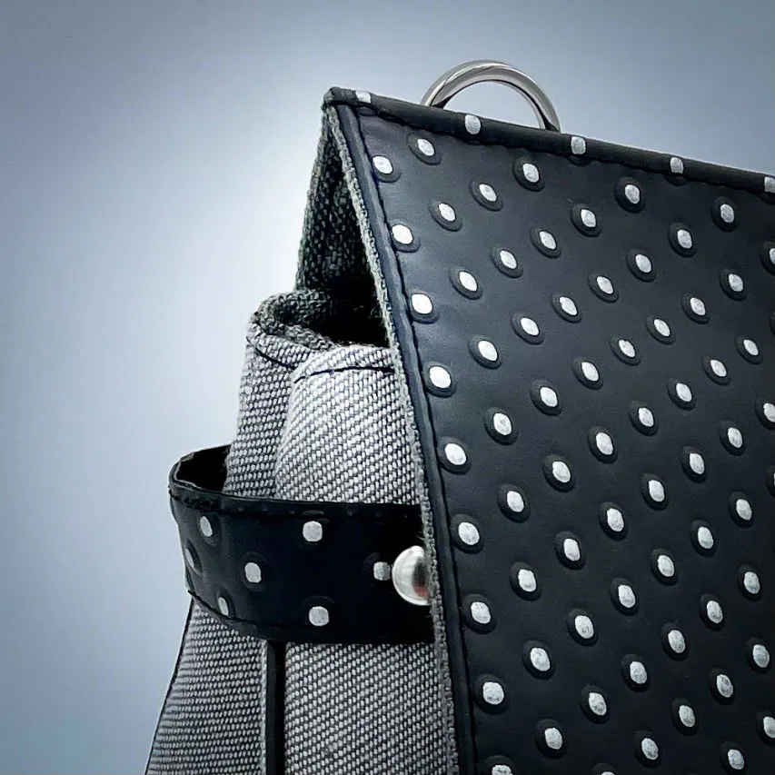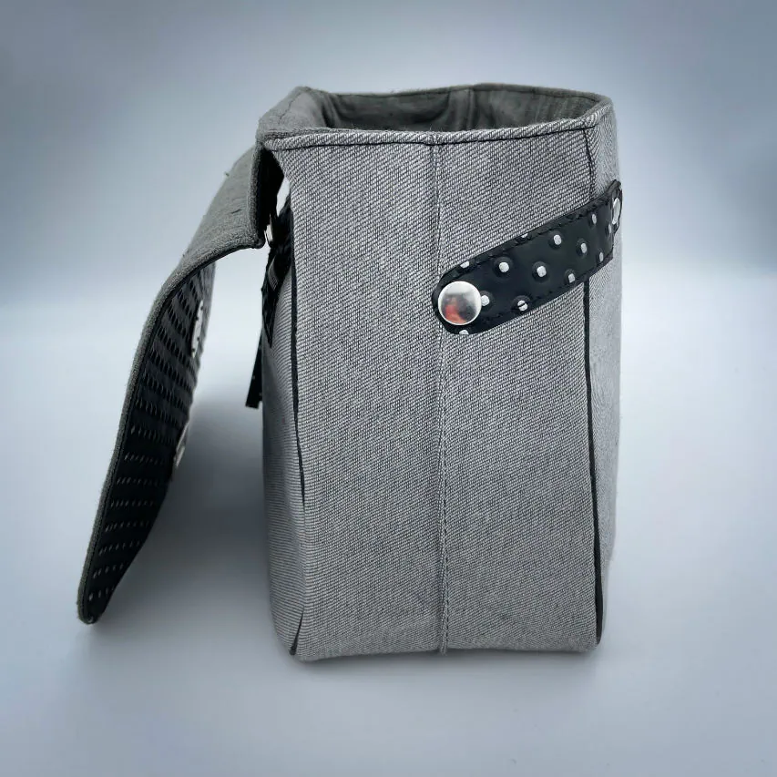 - Exterior: high-couture denim from dormant stock (98% cotton / 2% elastane) and upcycled vinyl (composition unknown) ;