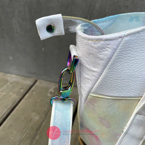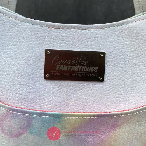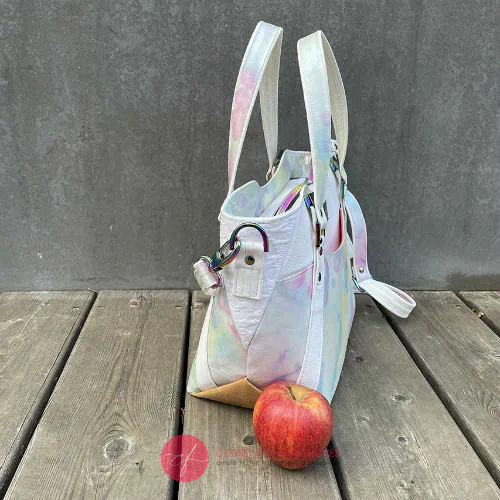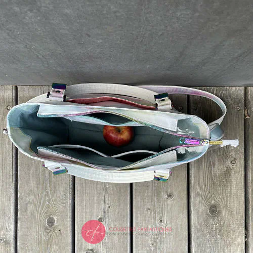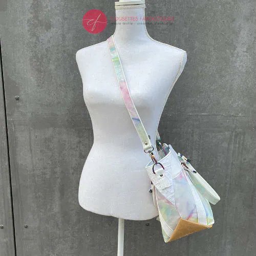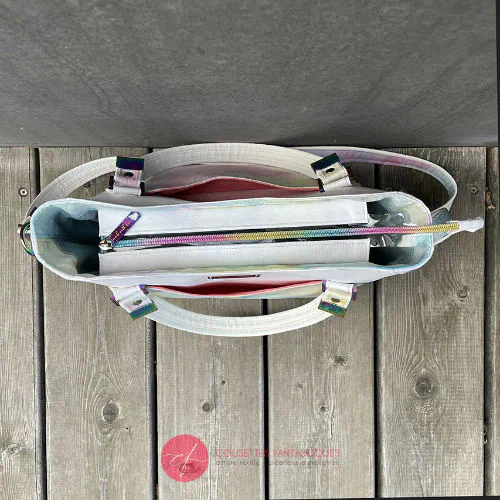 Significantly reduced price (normally 600€) due to some minor cosmetic defects (light blue marks on the vinyl, an unfortunate ironing mishap on one of the handle attachments, a word showing through the scarf at the back), and a small hole in one of the bottom corners that happened at the very last moment.