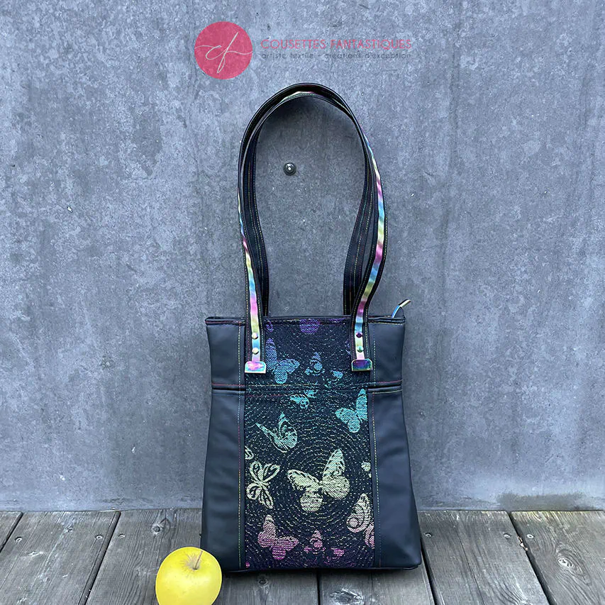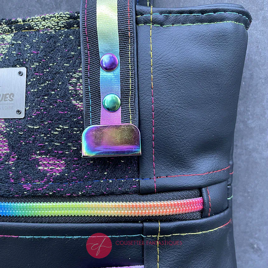 Embrace color with sobriety with this model in rainbow and night colors. Two-tone/two-material handles, luxury rainbow-colored hardware, velvety upcycled synthetic leather, and a playful babywearing fabric coupon with a whimsical pattern.