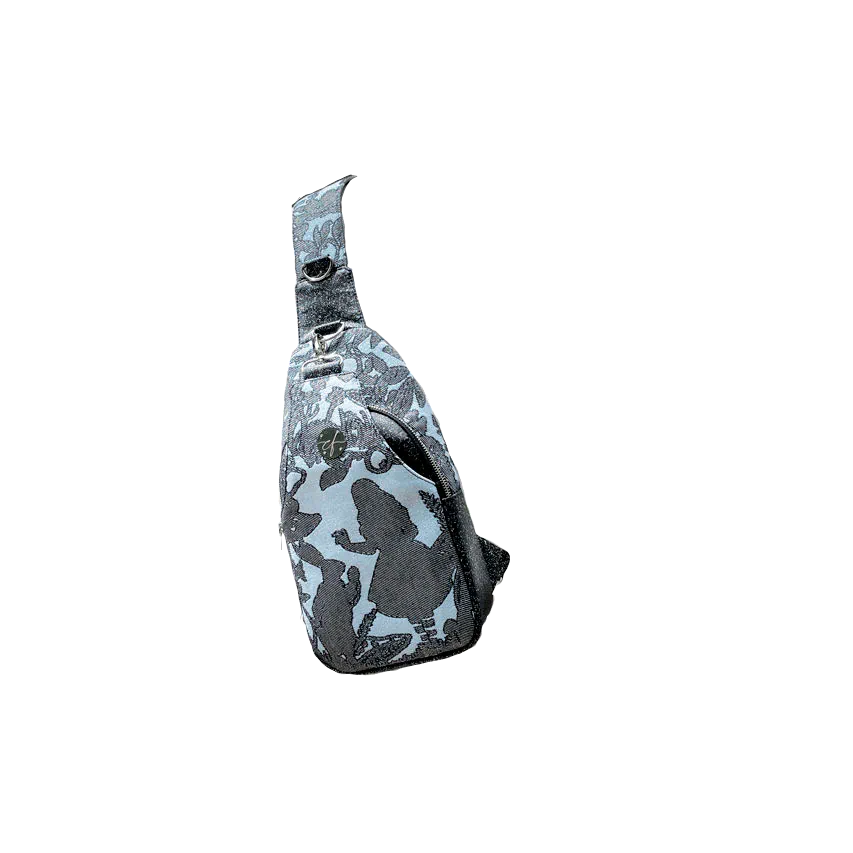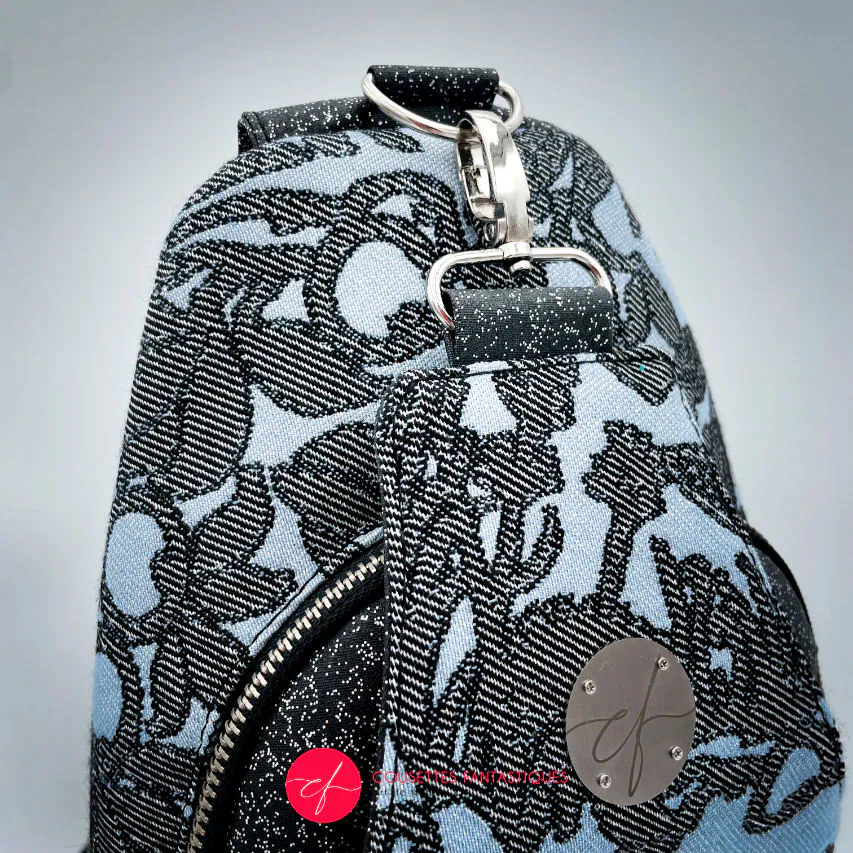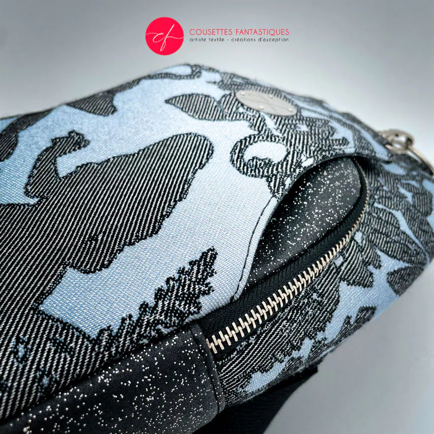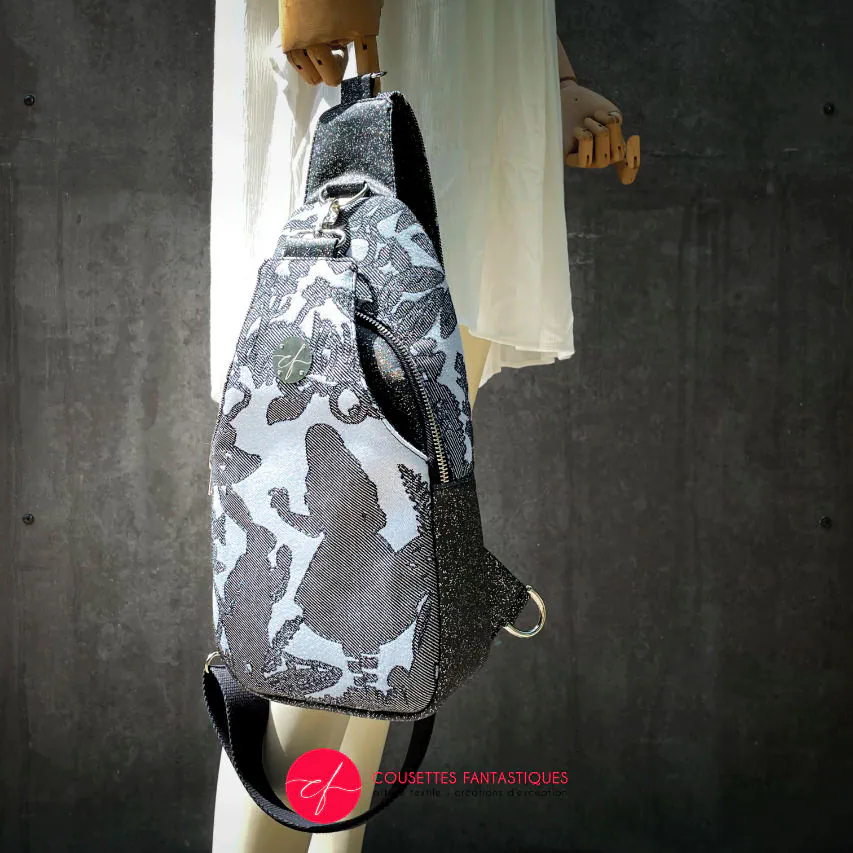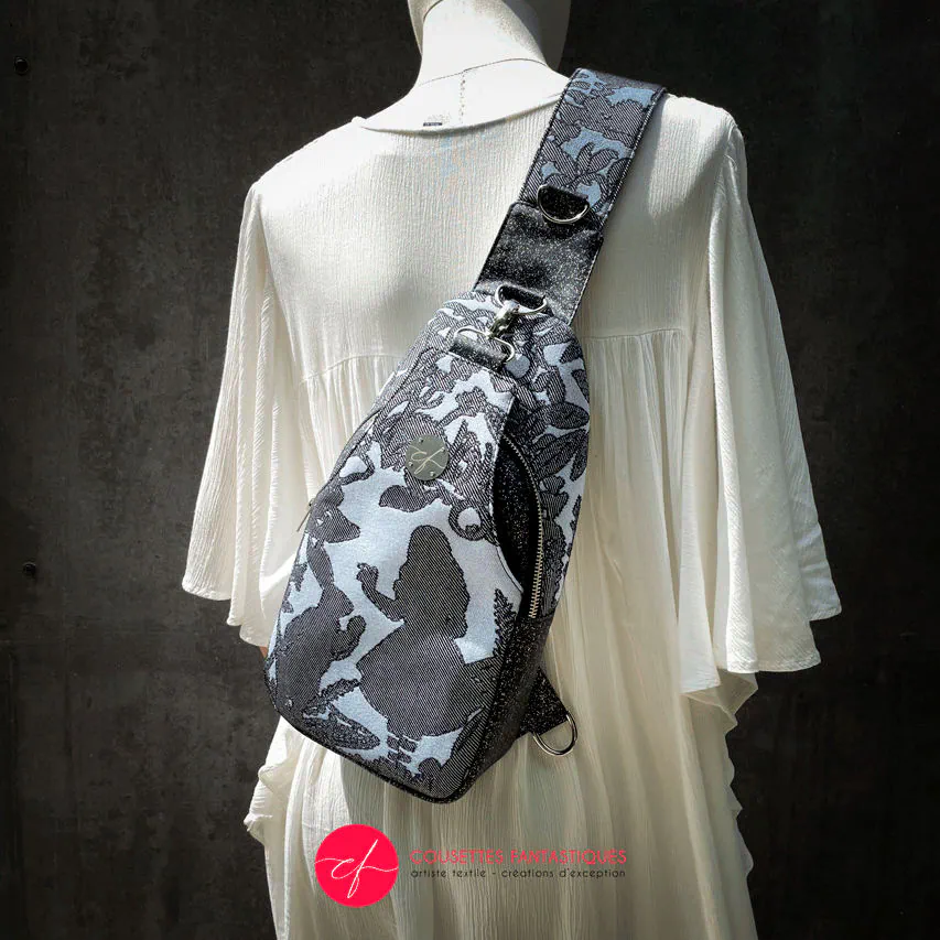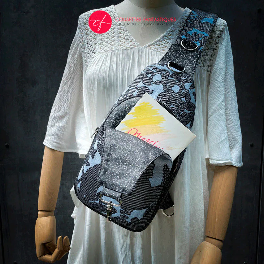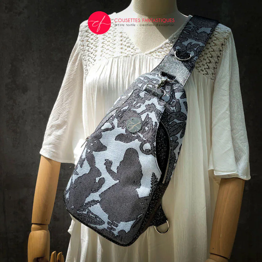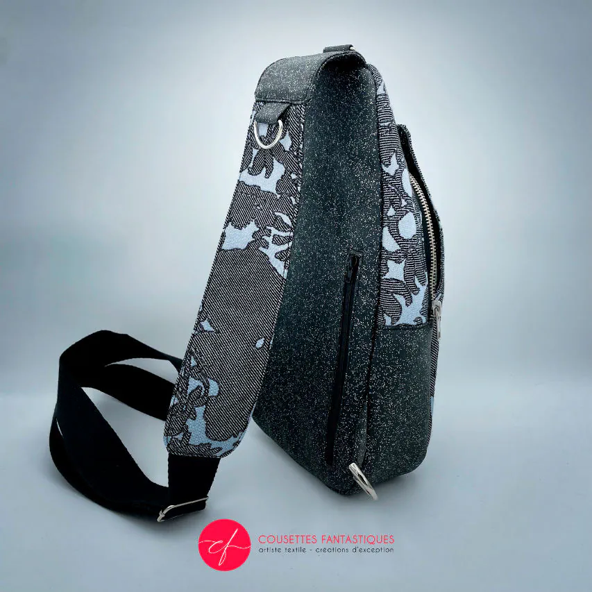 I've long wanted to play with this versatile bag that can be worn across the back and front. I searched to find the perfect design that combines clean lines and practicality. Its ability to feature a figurative panel convinced me. I also like its compact yet deep volume, numerous interior and exterior pockets, and a zipper closure that protects the main compartment.