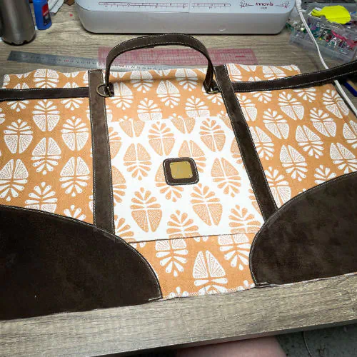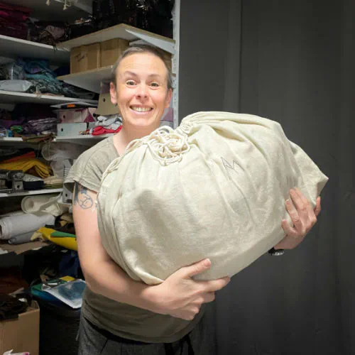 Après avoir commandé un sac en stock, Charlotte a réalisé qu'il serait trop petit. Je lui ai proposé de lui en faire un sur-mesure, plus grand, et elle m'a envoyé son écharpe pour la transformer.