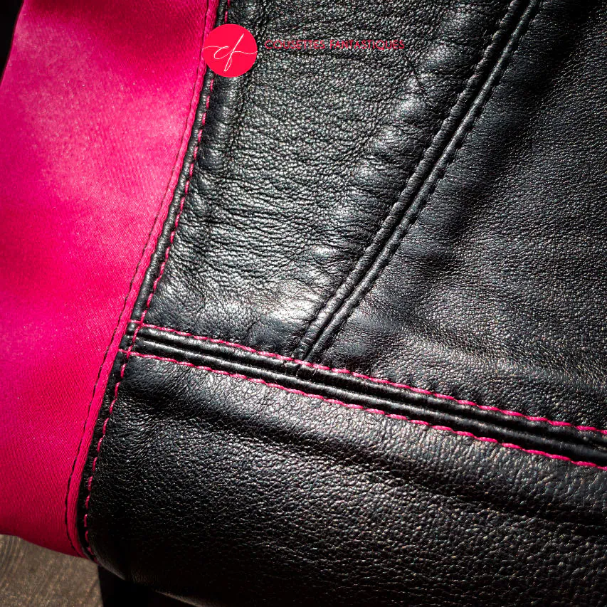 Une opposition entre modernité et tradition s'exprime dans cette pièce fortement contrastée aux formes rappelant les raviolis chinois. Le contraste frappant entre le rose néon presque fluorescent et le cuir noir, la texture tactile très lisse des matériaux se contrastant avec la texture visuellement floue du tissu en wrap, les découpes géométriques en opposition à la forme organique générale, le motif floral asiatique caché derrière des lignes ressemblant à des écrans de télévision sans signal... tout dissonne et pourtant tout résonne. L'équilibre dans l'oxymore.
