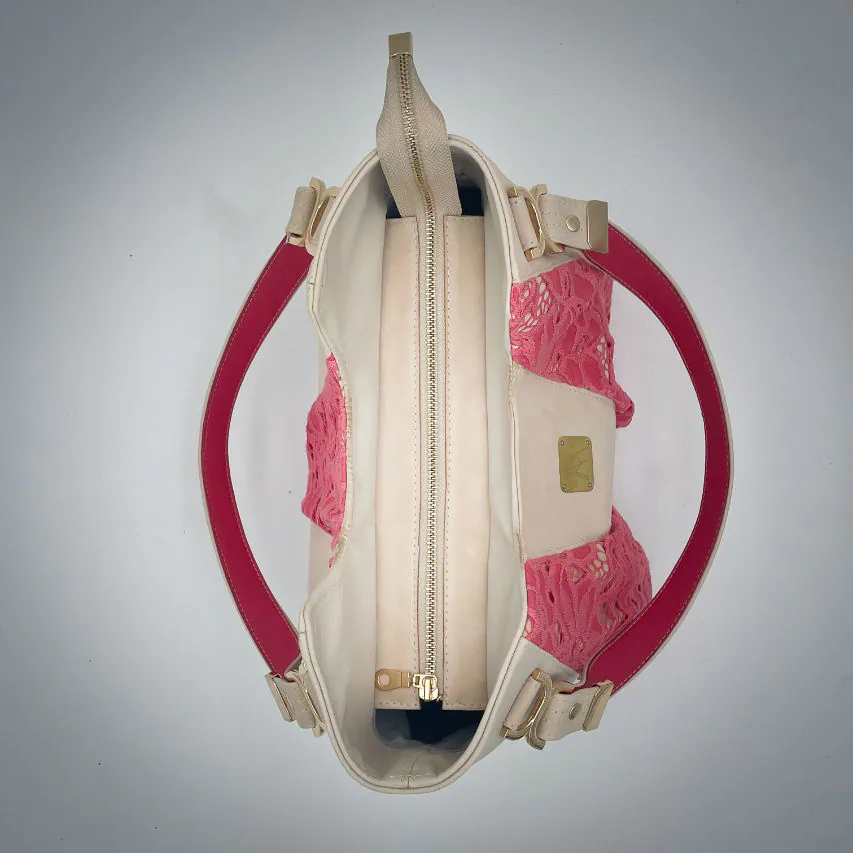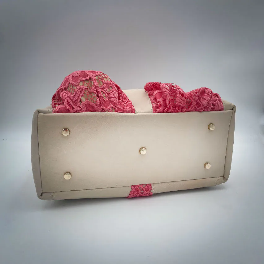 - Extérieur : peau de chèvre nappa, dentelle synthétique upcyclée, mousse d'ameublement upcyclée ;
