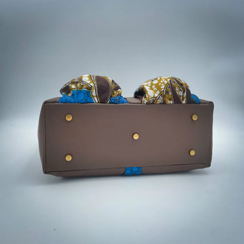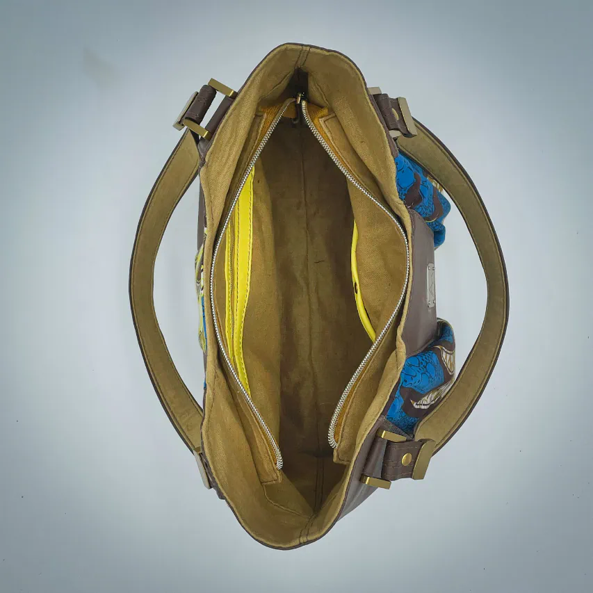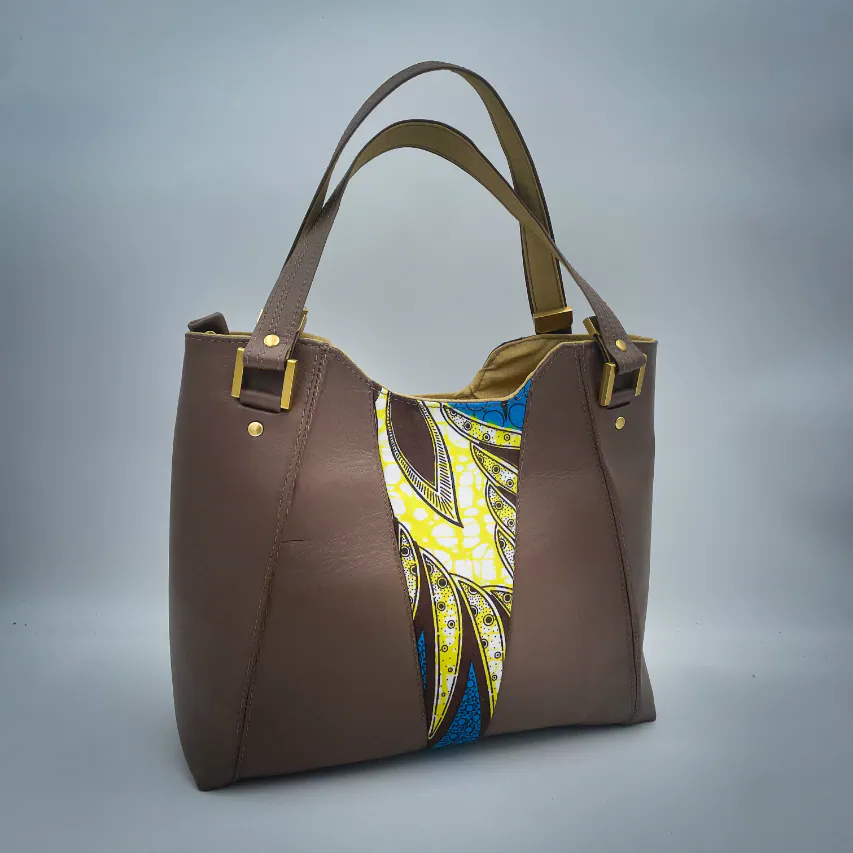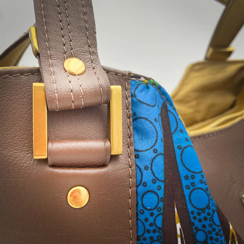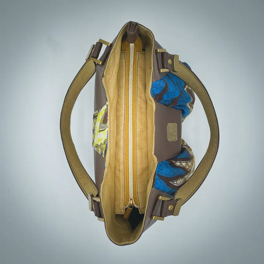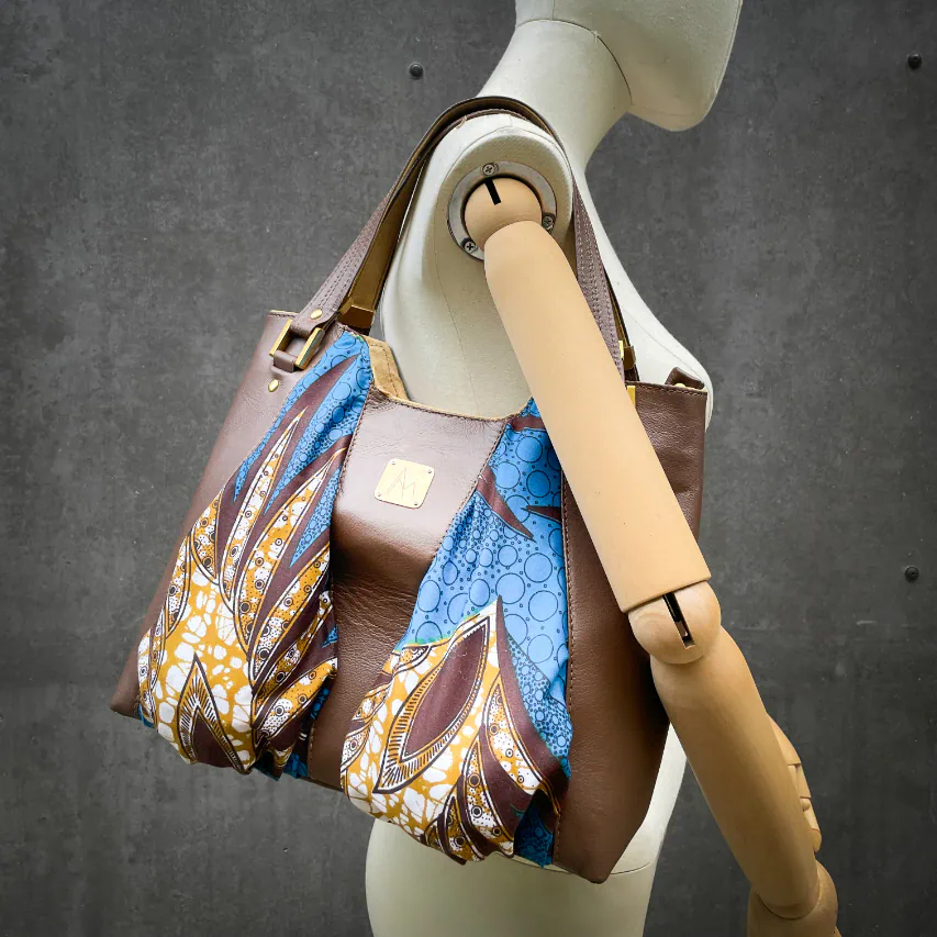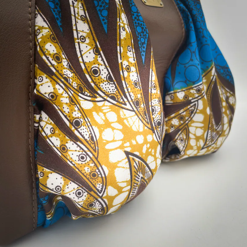 - Extérieur : peau de chèvre grainé, tissu wax upcyclé (100% coton), mousse d'ameublement upcyclée ;