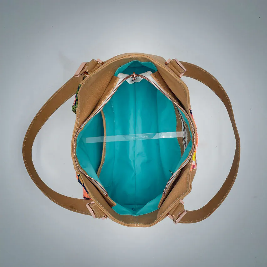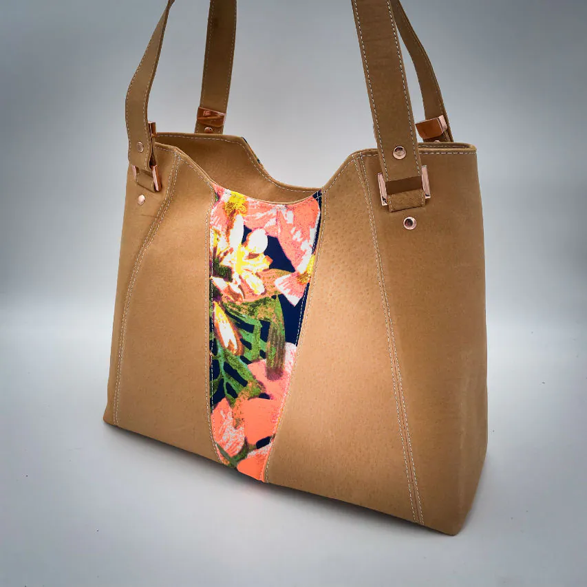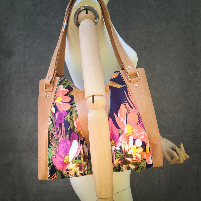 J'ai cherché un cuir qui ressemble à une peau humaine, le porc s'est imposé. Pour une fois, il ne sera pas upcyclé, n'ayant pas trouvé mon bonheur chez mes sources habituelles. Le tissu de “maillot de bain” est un paréo revalorisé, et la doublure couleur lagon est issue d'une fermeture d'atelier de couture.