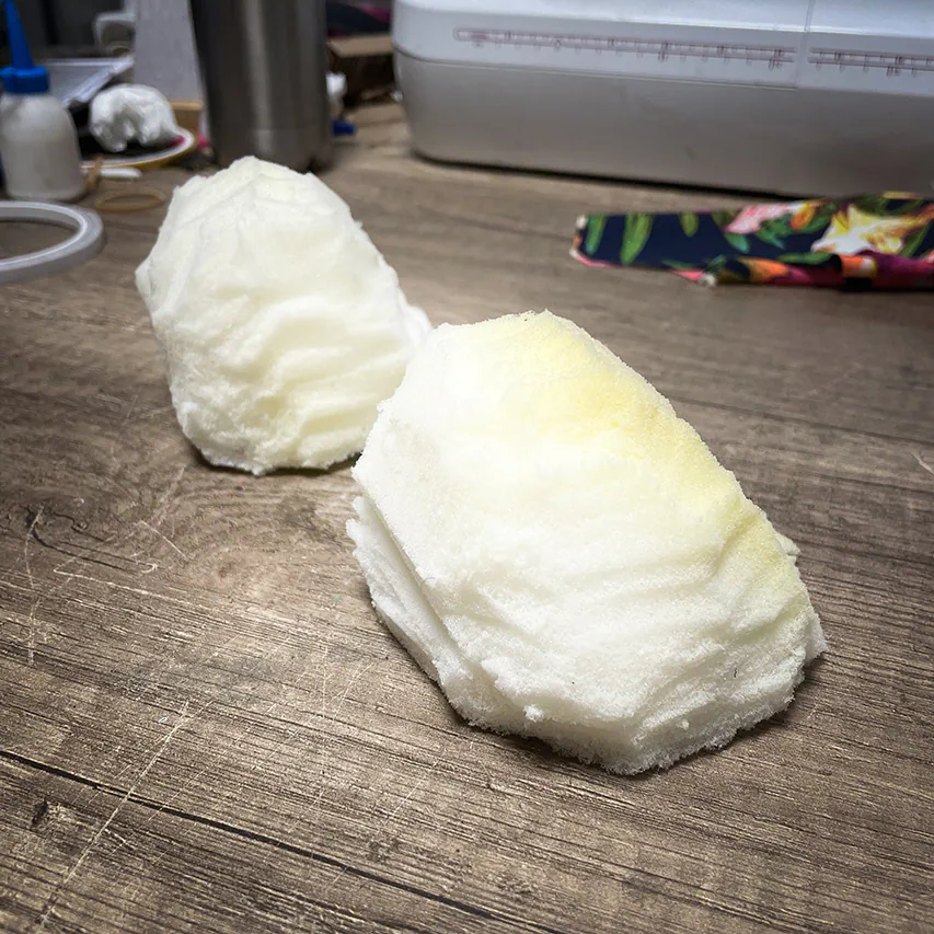 Pour les seins, j'ai racheté des chutes de mousse haute densité à un tapissier, et je les ai sculptés à la main, patiemment. Mon mari m'a donné son avis, aussi ;) Enfin, j'ai patronné le “maillot” directement sur les formes.
